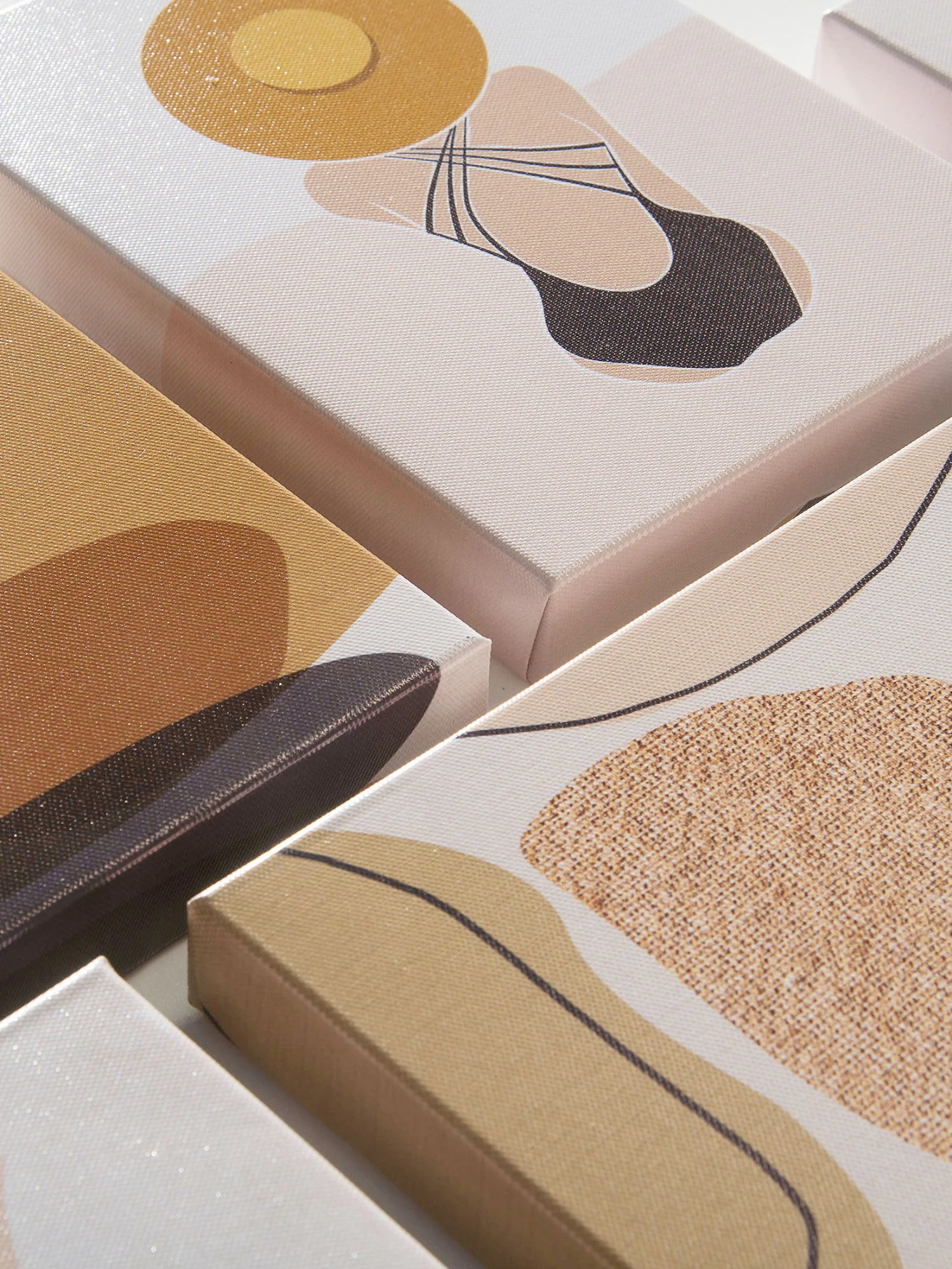 Auf stabilem Echtholzrahmen gespannt. Leinwandstruktur. Inkl. Befestigungsmaterial. Das Set besteht aus fünf Bildern. Größen: 2 x ca. 25 x 25 cm, 3 x ca. 15 x 20 cm.