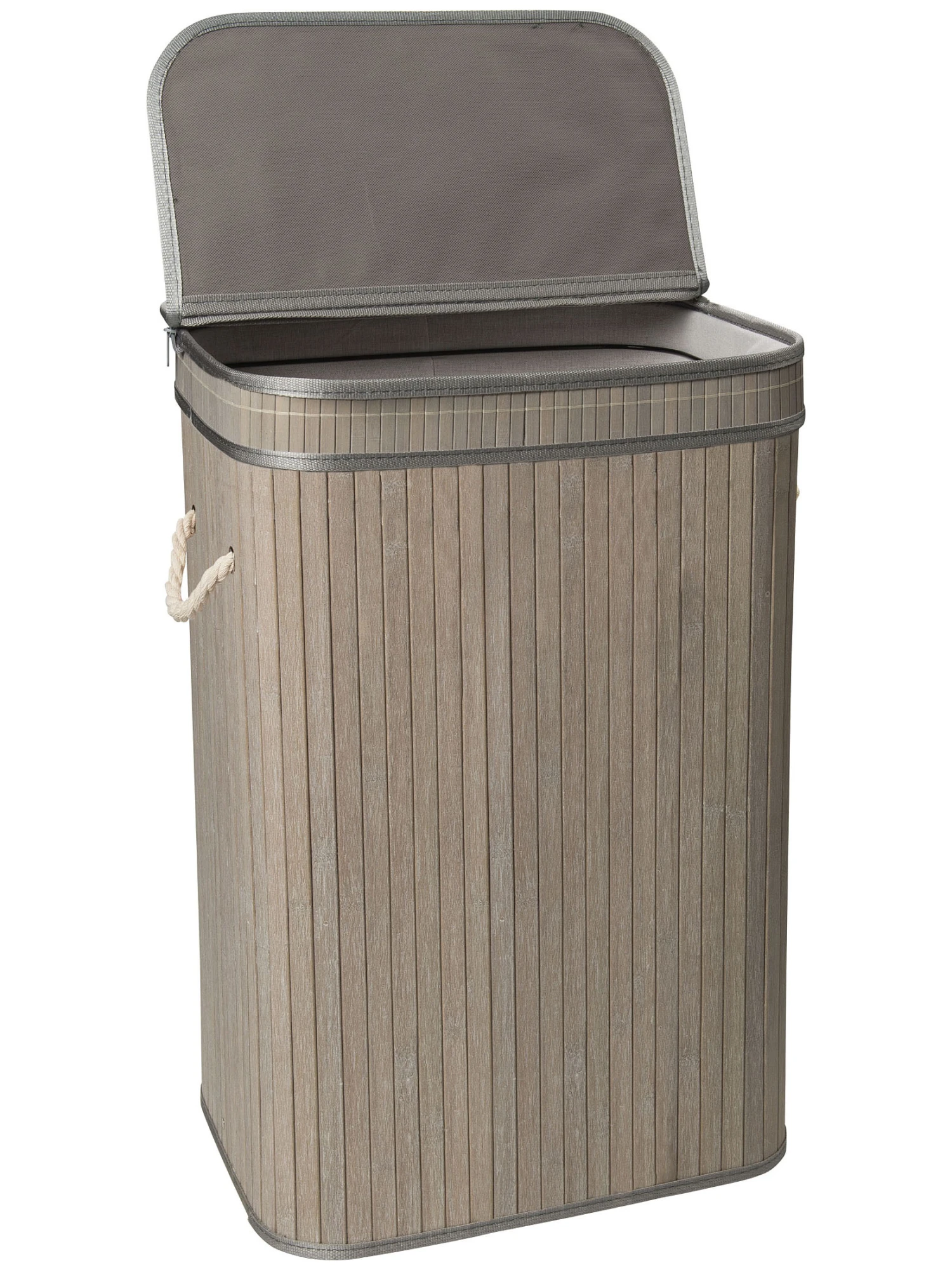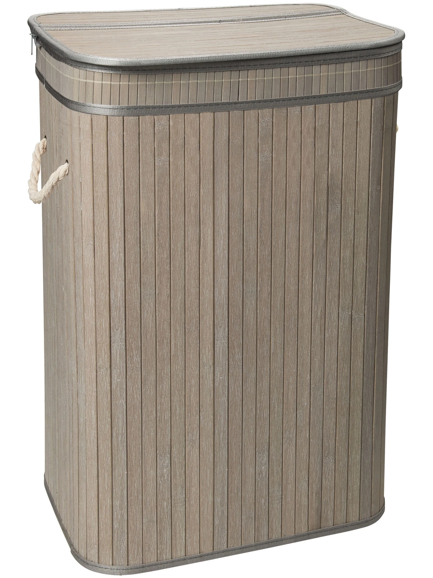 Wäschekorb aus Bambus. Innen mit Baumwollstoff ausgekleidet. Der Deckel ist mit einem Reißverschluß am Korpus befestigt und auch komplett abnehmbar. Mit Kordel-Griffen.
