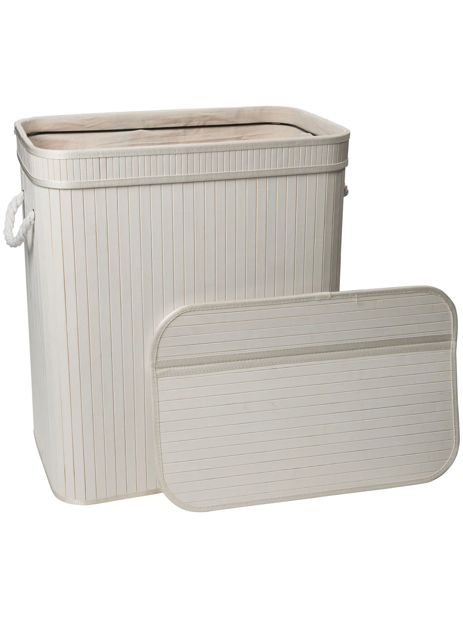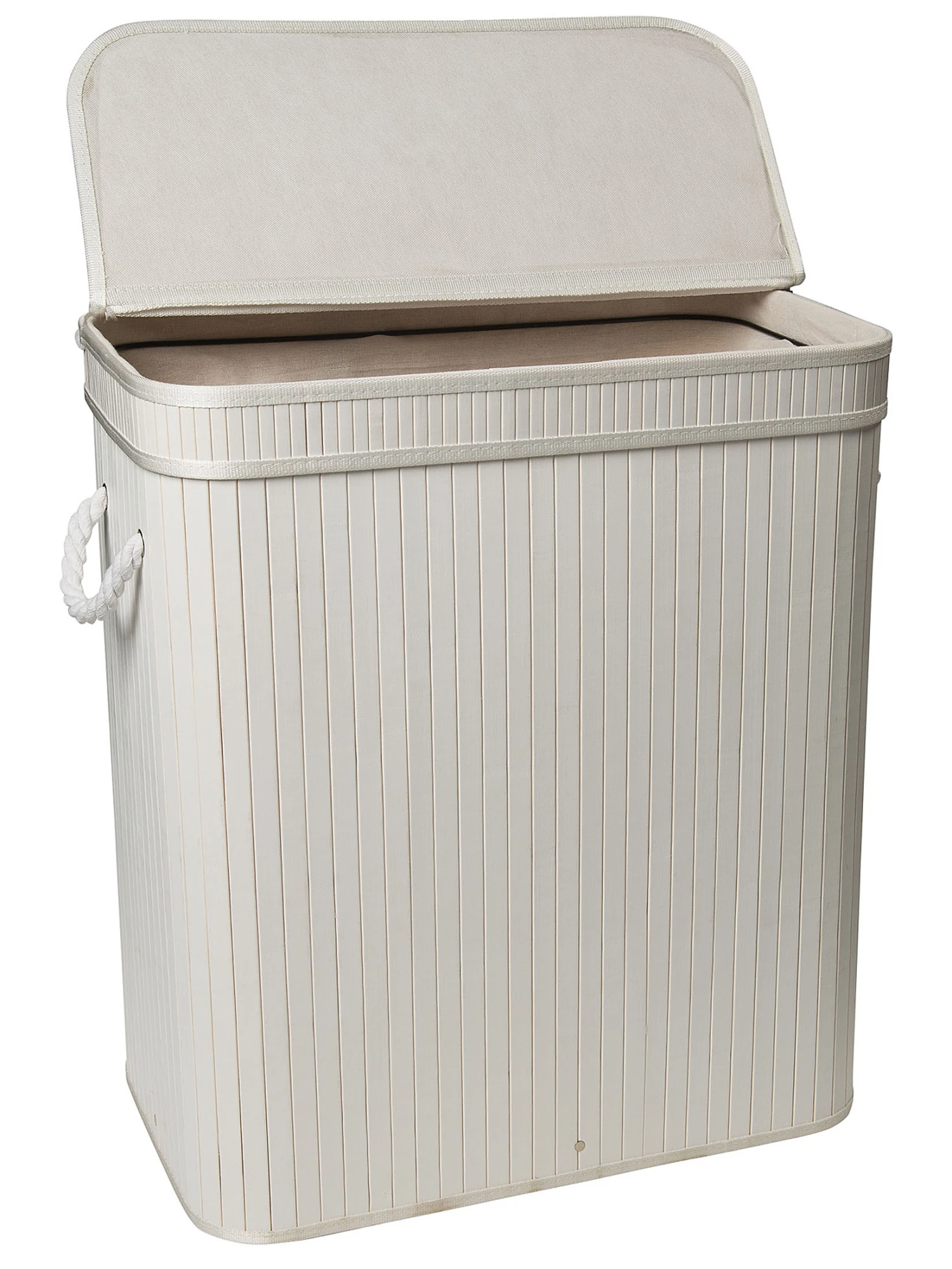 Extragroße Wäschetruhe aus Bambus. Das Innere ist mit Baumwollstoff ausgekleidet. Der Deckel ist an der Truhe mit einem Reißverschluss befestigt und kann auch komplett abgenommen werden. Der Korb hat zwei Kordel-Griffe.