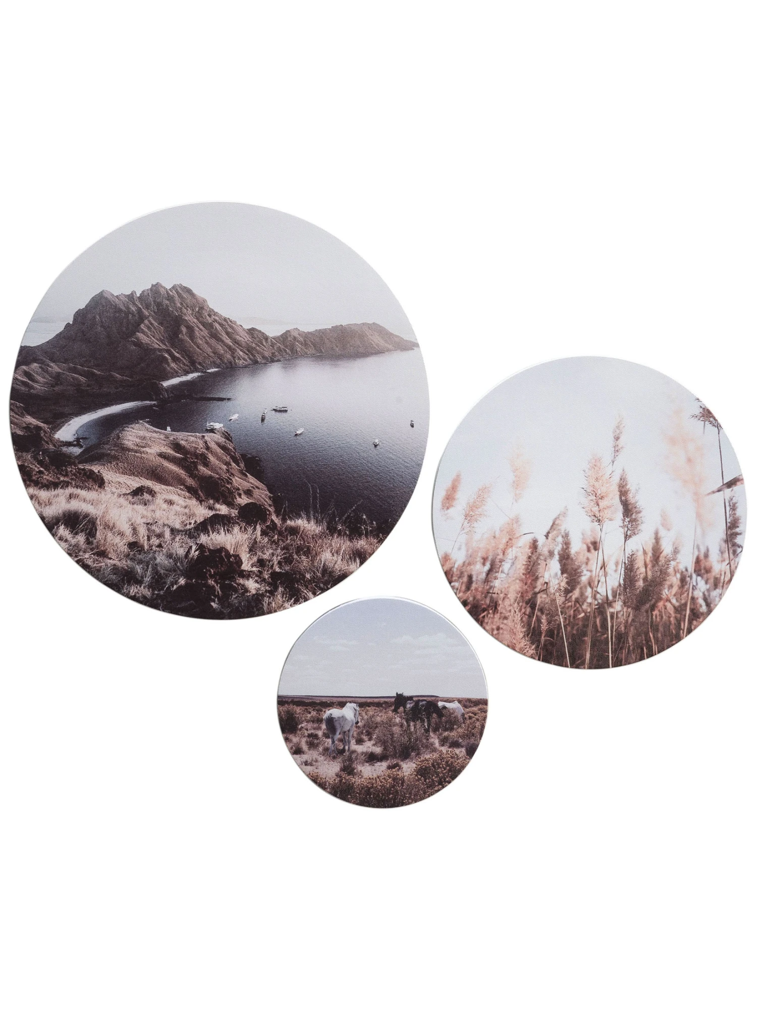 Kunstdruck-Serien auf Leinwand. Auf Holzrahmen gespannt. 3er Set bestehend aus den Größen ca. 20 cm Ø, ca. 30 cm Ø und ca. 40 cm Ø.