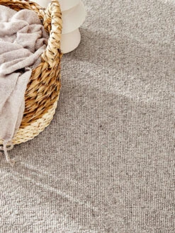 Klassischer, naturfarbener schwerer Woll-Teppichboden mit dezenter Zeichnung. Gesamtgewicht ca. 1670 g pro m². Höhe ca. 7 mm. Flor 100 %