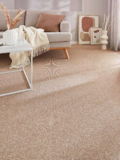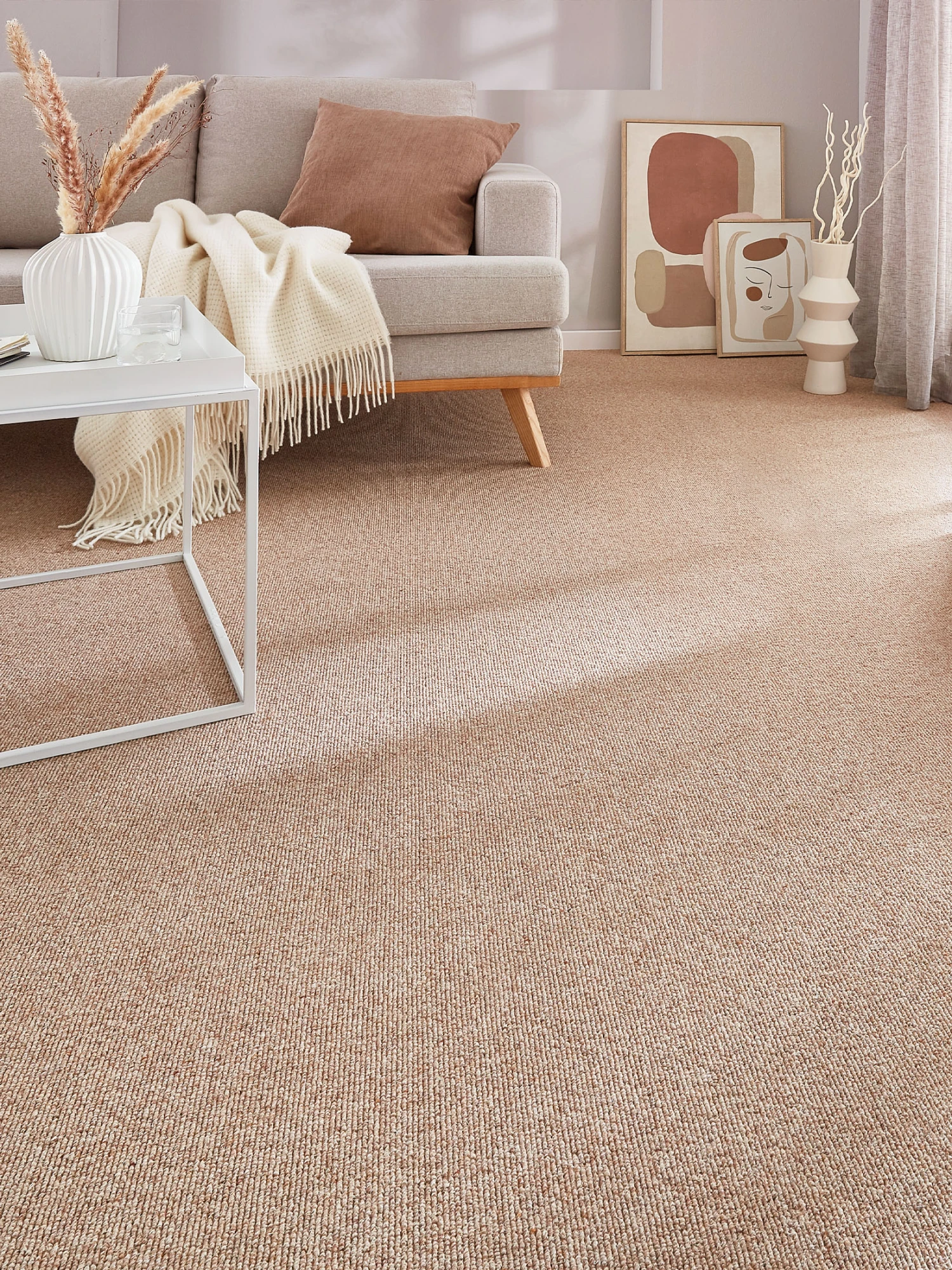 Klassischer, naturfarbener schwerer Woll-Teppichboden mit dezenter Zeichnung. Gesamtgewicht ca. 1670 g pro m². Höhe ca. 7 mm. Flor 100 %